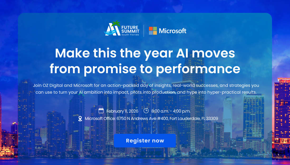Couldn’t make it to the Microsoft AI Workshop: Make AI Agents Work for You? Catch our on-demand session to learn how Microsoft and OZ Digital are putting AI and AIAgents to use to power smarter transformation solutions for business, improve ROI, and drive profitable growth.