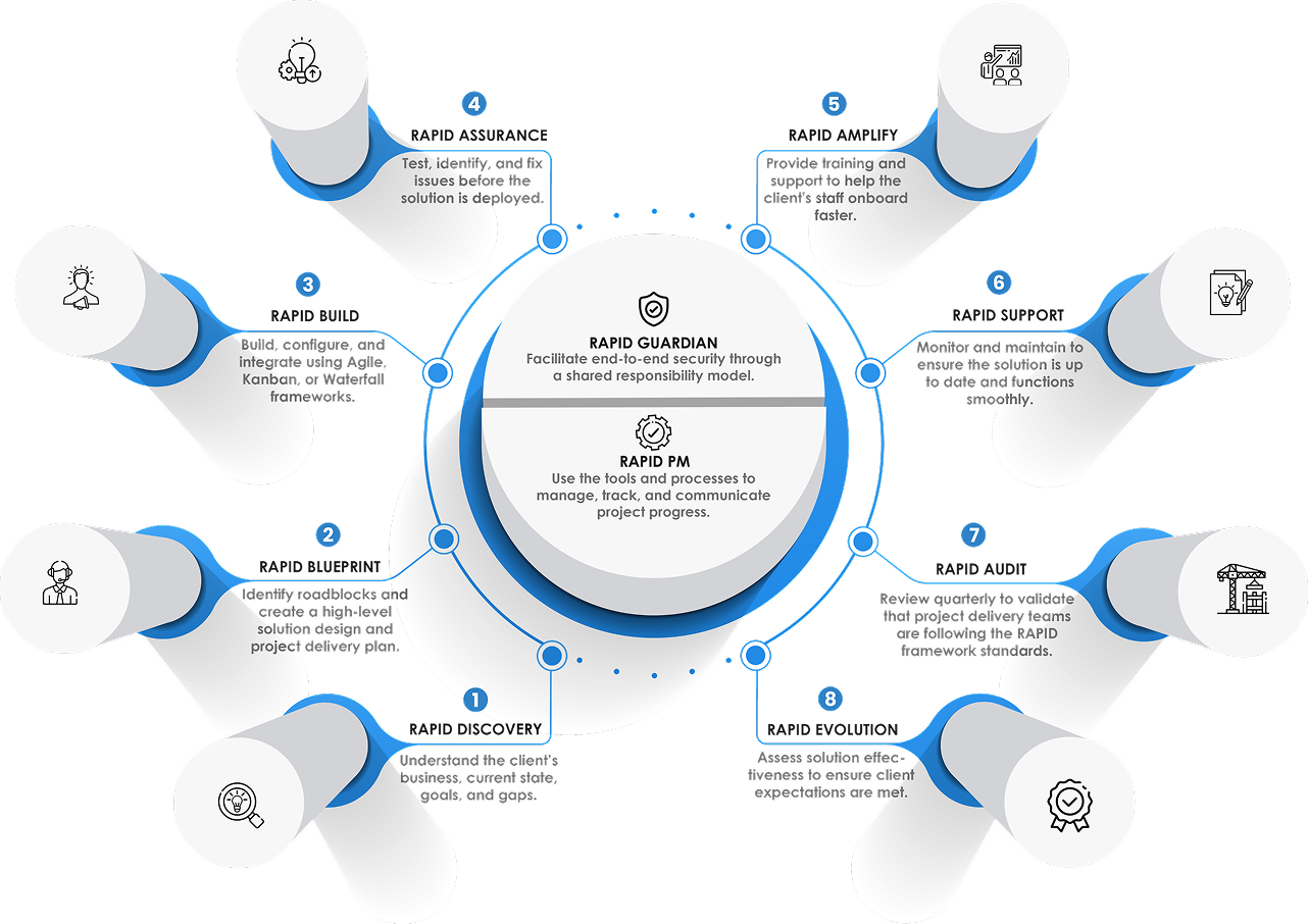 RAPID (Rapid Application and Project Implementation and Delivery) is how we build AI solutions faster and smarter. A flexible, collaborative approach, RAPID combines ten connected layers to guide projects from idea to implementation. And along the way, ensures teams stay true to their goals, meet the highest standards, and deliver consistent quality.